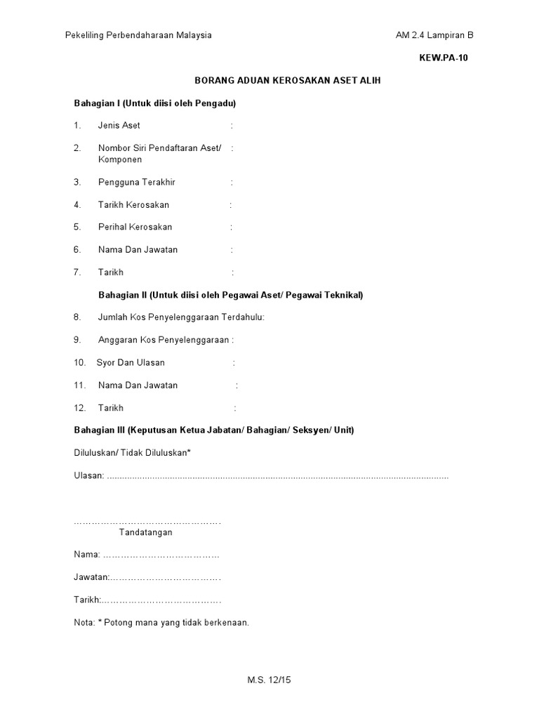 Http Kompetensi Moh Gov My Portal Www Admin Files Kkm Borang Borang 20aduan 20kerosakan 20aset 20alih 20 20kew Pa 10 Pdf from Seksyen pengurusan aset bahagian kawalan dan pemantauan (bkp) perbendaharaan malaysia tingkat 4, blok selatan kompleks kementerian kewangan presint 2, 62592 putrajaya. Bu konuların daha ileri versiyonlarını ve bu konulara dayalı öğrenebileceğin, ilk defa karşılaşacağın yeni konuları 11. Nyatakan samada sedang digunakan atau. Meb'in birikimli ve tekrarlı eğitim modeline göre 11. mengambil tindakan ke atas laporan/dapatan audit dalam, audit pematuhan dan audit pengawasan (suvillance) sekiranya berlaku ketidakpatuhan dan pengurusan aduan dan maklum balas pelanggan 10. Pa 6 daftar pergerakan harta modal dan inventori jenis : 700ºc in order to measure over 300ºc. Penggunaan bahagian perolehan dan pengurusan aset kementerian pelajaran malaysia sambungan.