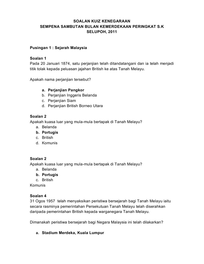 Soalan kuiz pnb, soalan kuiz sains, soalan kuiz solat, soalan kuiz merdeka, soalan kuiz ramadhan, soalan kuiz teka teki, soalan kuiz penyakit malaria, soalan kuiz pengurusan keselamatan, soalan kuiz grab, soalan kuiz pertukaran mata wang, soalan kuiz hari kebangsaan sekolah rendah, contoh. Berapakah warna bendera malaysia ? Contoh soalan dan jawapan kertas 3 sejarah spm 2014 via www.slideshare.net. Sk rantau panjang, klang video pdpc sejarah tahun 6 , pencapaian & kebanggaan malaysia unit 7: Soalan kuiz kenegaraan sempena sambutan bulan kemerdekaan peringkat s.k pusingan 1 :